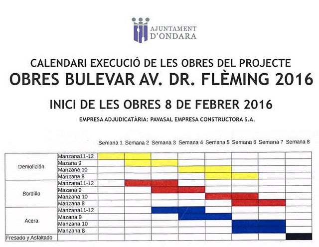 Durant la primera setmana (del dilluns 8 al divendres 12 de febrer) s’actuarà realitzant obres a les illes 11 i 12 (tram de Doctor Fleming comprès entre els carrers Verge de la Soledat i l’aparcament del MasyMas). La segona setmana (del 15 al 19 de febrer) s’actuarà a les illes 11 i 12, i en la 9 (tram de Doctor Fleming comprès entre els carrers Verge de la Soledat i Doctor Barraquer). La setmana tercera (22-26 de febrer) s’actuarà a les illes 9, 10 i 11-12. La quarta setmana (29 de febrer-4 de març), a les illes 9, 10 (carrer Blasco Ibáñez), 11 i 12. La cinquena setmana (7-11 de març) els treballs afectaran l’illa 8 (tram entre Blasco Ibáñez i Doctor Barraquer), 9, i 10. La sisena setmana (14-18 març), en les illes 8, 9 i 10. La setena setmana (21-25 març), a les illes 8 i 10.