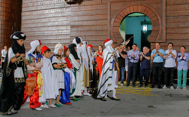 Els joves Josep Moral Portero, de la comparsa Llauradors, pel bàndol cristià; i Nataxa Calabuig Belda, de la comparsa Mossàrabs, pel bàndol moro, els guanyadors del XXXIII Concurs Infantil de Caps d’Esquadra que organitza la Societat de Festers del Santíssim Crist de l’Agonia d’Ontinyent, i que es va celebrar anit a la Plaça Major.