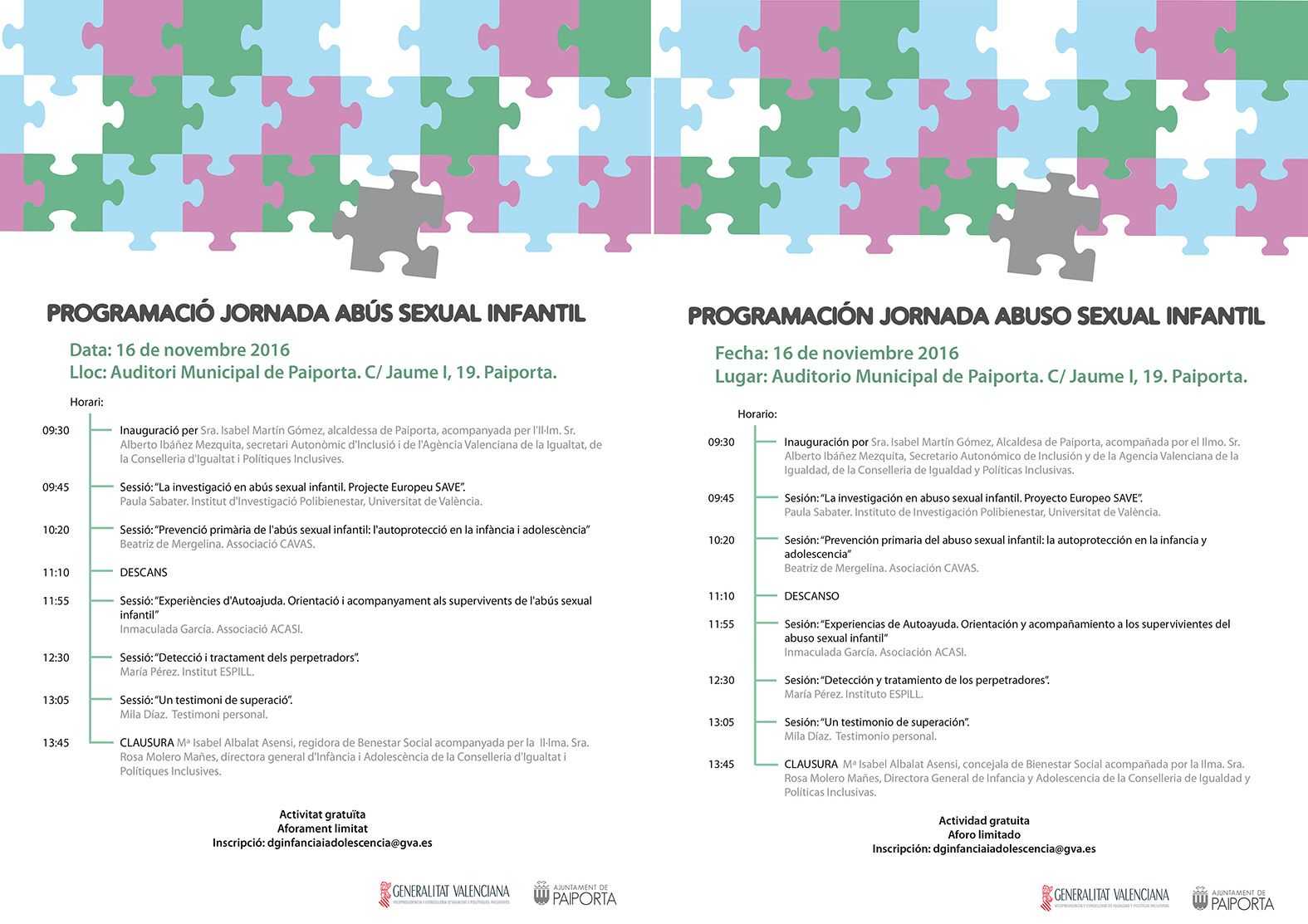 Per últim, a les 13.45 hores tindrà lloc la cloenda, a càrrec de la regidora de Benestar Social de Paiporta, Maribel Albalat, i la directora general d’Infància i Adolescència, Rosa Molero. La jornada és gratuïta, està oberta al públic en general, i tan sols requereix inscripció prèvia enviant un correu electronic a dginfanciaiadolescencia@gva.es.