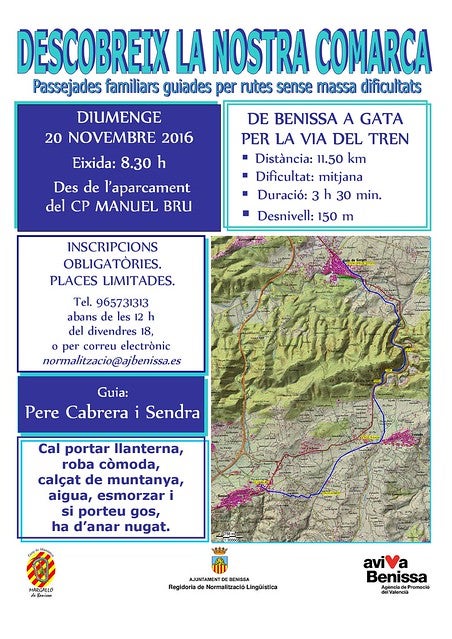 Si les condicions meteorològiques impediren fer la passejada en condicions, s’anul·laria el mateix dia. Aquest cicle d’excursions està organitzat pel Grup de Muntanya Margalló i la regidoria de Normalització Lingüística de l’Ajuntament de Benissa. La pròxima passejada es realitzarà el diumenge 18 de desembre de 2016.