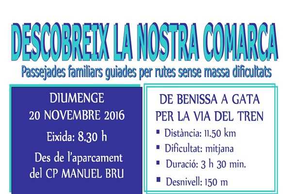 A les 8.30 h s’eixirà caminant des de l’aparcament del Col·legi Públic Manuel Bru de Benissa fins a l’Estació del Tren de Benissa, on s’inicia el camí seguint les travesses de la via fins a Gata.