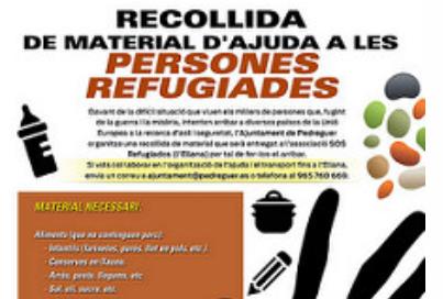 La Regidoria de Benestar Social de l’Ajuntament de Pedreguer ha organitzat una recollida de material d’ajuda a les persones refugiades, en col·laboració amb l’associació En Red SOS Refugiados (l’Eliana). Amb aquesta finalitat, s’ha habilitat un termini (entre els dies 18 i 20 d’abril), durant el qual tothom que ho desitge podrà entregar a la Casa de la Cultura efectes bàsics, com ara aliments no peribles, productes d’higiene i sanitaris, material escolar, etc., que seran traslladats fins a l’Eliana i posteriorment fins als campaments de refugiats situats als Balcans. En aquest sentit, des de l’Ajuntament s’ha fet una crida a la implicació ciutadana, per tal de col·laborar en l’organització i el transport de l’ajuda fins a la localitat del Camp de Túria.