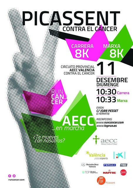 El pròxim 11 de desembre, Picassent celebra la IV edició de la carrera contra el càncer, un recorregut de 8 kilòmetres de solidaritat i lluita contra esta malaltia. Les inscripcions, a un preu de 5 euros, es realitzaran via on line a través de la plataforma www.runcancer.com o www.toprun.es. Així també, els dies 1, 2, 7 i 9 de desembre, els membres de la Junta Local contra el Cáncer de Picassent, estaran a la seu social del Musical, C/ Nou nº 17, de 17 a 19:30 hores per realitzar inscripcions.