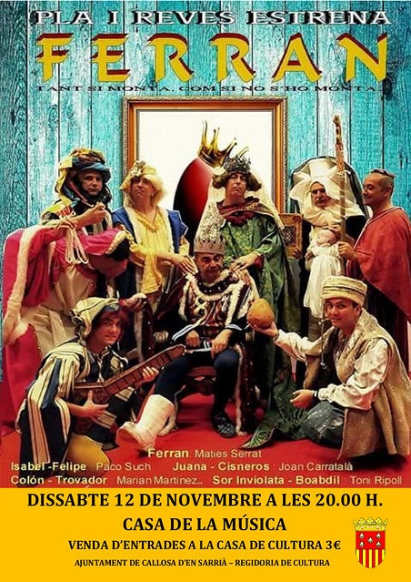‘Ferran’ és una divertida comèdia en valencià sobre Ferran El Catòlic, qui es troba a punt d’abandonar aquest món, i en els últims moments de la seua vida tan sols vol ser feliç. En la seua habitació, envoltat de quadres; començaran a sentir-se veus conegudes, persones que han tingut a veure alguna cosa amb ell, i que per sort o desgràcia, l’han molestat en la vida.