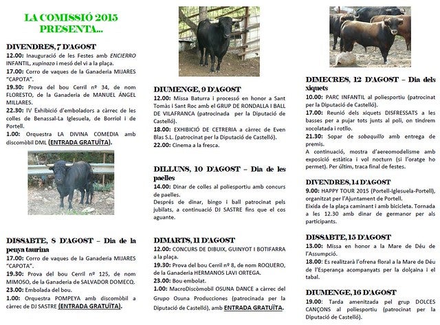 Demà dissabte es celebra el dia de la penya taurina. Per a això, es soltarà a la vesprada una rotllana de vaques de la ramaderia Mijares “Capota” i es provarà un bou cerril de la ramaderia de Salvador Domecq que també s’embolarà a la nit. La festa arribarà amb l’orquestra Pompeya i la discomòbil Disastre.