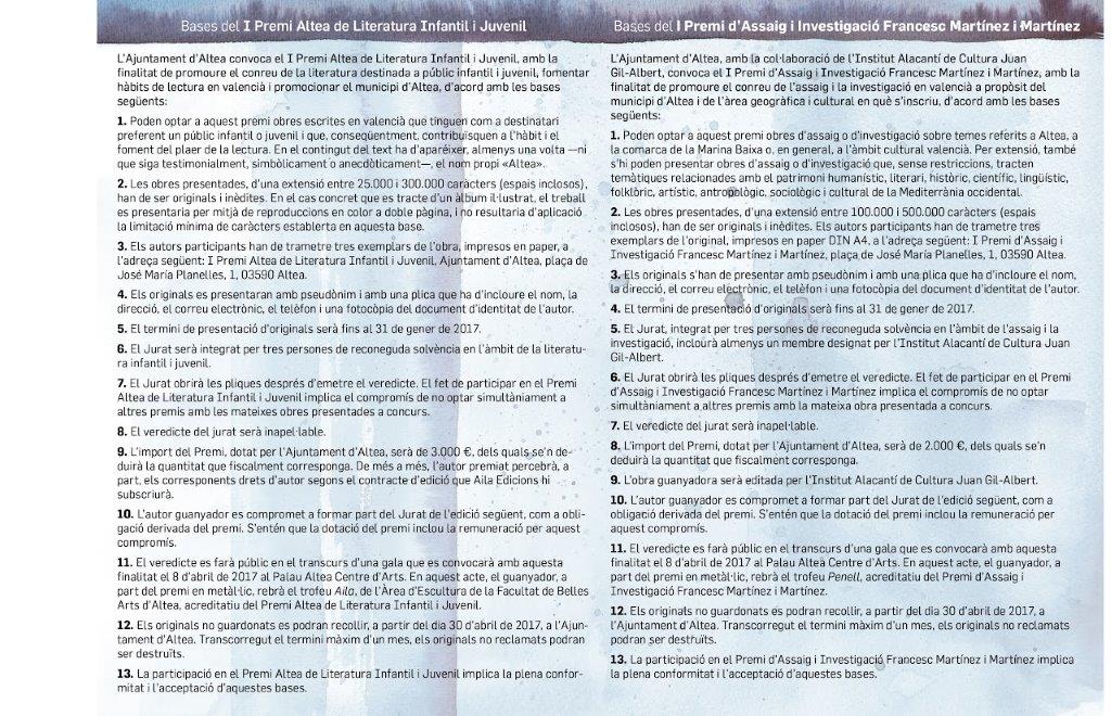 El termini de presentació dels originals serà fins al 31 de gener. El veredicte dels premis es farà públic en el transcurs d’una gala que es convocarà el 8 d’abril de 2017 al Palau Altea Centre d’Arts. Les bases establides es poden consultar al web municipal, altea.es