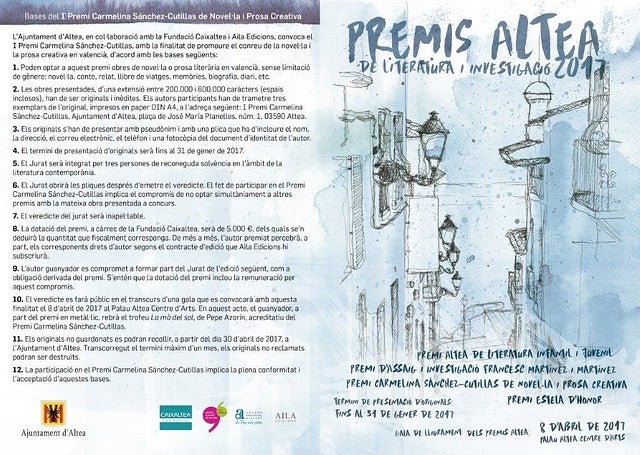 Per la seua banda, José Miguel Cortés, ha mostrat el suport als premis a través de la Fundació Caixaltea, que és l’hereva de l’Obra Social de Caixaltea, que ha patrocinat esdeveniments culturals a la nostra localitat al llarg dels últims 50 anys. El I Premi Carmelina Sánchez-Cutillas de Novel·la i Prosa Creativa, es convoca per l’Ajuntament d’Altea amb la col·laboració de la Fundació Caixaltea i Aila Edicions. La dotació del premi, a càrrec de la Fundació Caixaltea, serà de 5.000 euros. A més el guanyador rebrà el trofeu acreditatiu La mà del sol, de Pepe Azorín.