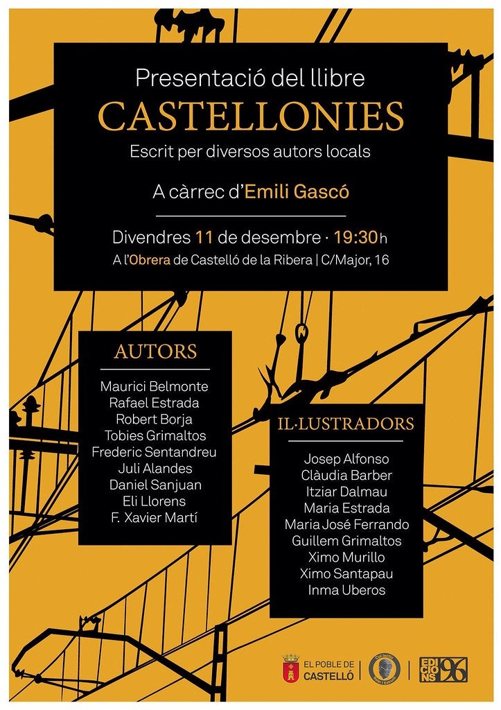 Nou escriptors del poble han confegit un llibre que portarà per títol Castellonies i que, com podeu imaginar, està format per textos que parlen del nostre Castelló. En la seua major part, es tracta de relats de ficció i hi ha també algun escrit memorialístic, però en tots ells l’acció, verídica o inventada transcorre al nostre poble. A més, uns altres nou castellonencs han il·lustrat els textos, de manera que tot plegat constitueix un fet inèdit i històric: un llibre sobre Castelló fet per dihuit persones del poble (nascuts o habitants, hòmens i dones).