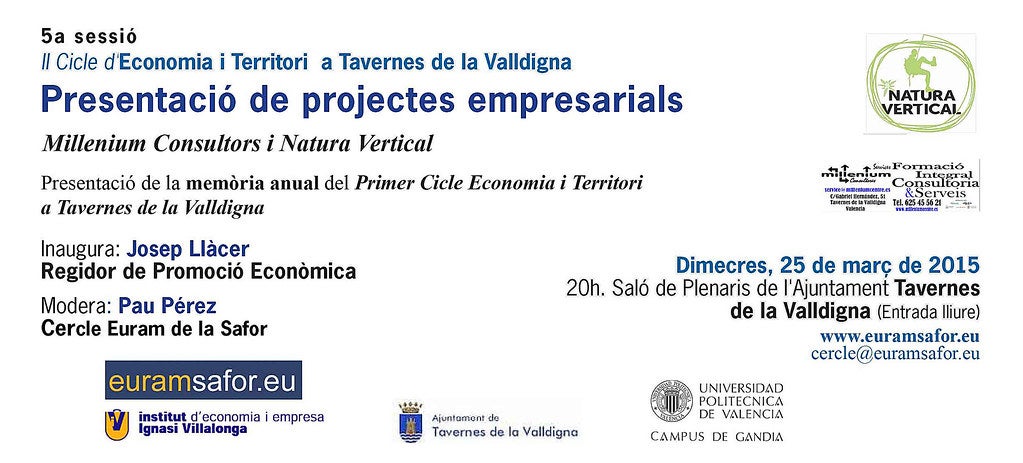 L’acte de presentació de les empreses “Millenium Consultors” i “Natura Vertical” s’ha anunciat per al pròxim dimecres, dia 25, en el Saló de Plenaris de l’Ajuntament, amb entrada lliure. Serà aprofitat també per presentar oficialment la publicació que serveix de balanç a les activitats dutes a cap en el “I Cicle Economia i Territori a Tavernes de la Valldigna”.