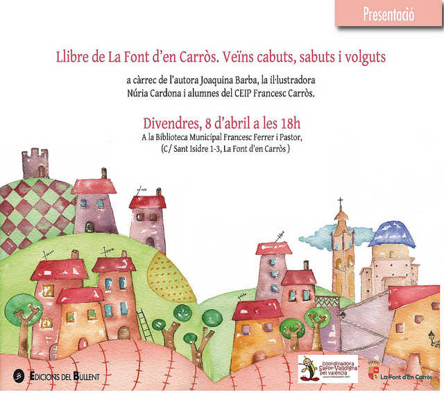 Presentació del llibre “Llibre de la Font d’en Carròs: veïns cabuts, sabuts i volguts”, a càrrec de la seua autora Joaquina Barba i alumnes del CEIP Francesc Carròs. (ACTE PRE-TROBADA)