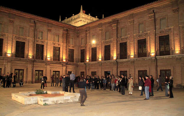 Potser la visita més espectacular de la nit va ser la del pati interior del claustre. A l’aire lliure, amb accés a través dels 36 finestrals decorats amb els escuts de poblacions valencianes, però, sobretot, il•luminat. Una imatge poc habitual, el pati de nit lluint amb tota la seua esplendor.
