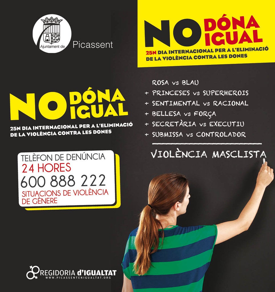 La campanya que porta per títol, No dóna igual, treballa en aspectes de sensibilització, formació i educació, ja que sense la inculcació d’estos valors no serà possible aconseguir la modificació i eradicació de la violència masclista.
