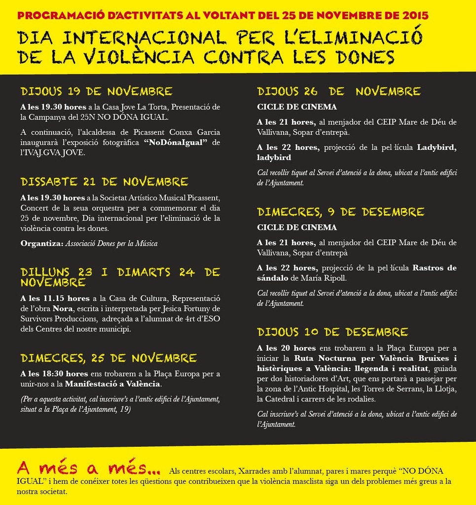 La campanya ja es pot vore a tots els espais públics, als comerços del nostre municipi i als canals de comunicació de l’Ajuntament de Picassent. Com sempre s’ha dissenyat una programació que “té com a objectiu principal estendre el missatge de la nostra campanya, posar en dubte els mandats de la nostra societat, mitjançant xerrades i sessions de sensibilització que s’oferiran a la ciutadania en general amb els centres escolars i les associacions del municipi”, ha assenyalat l’alcaldessa del municipi, Conxa Garcia.