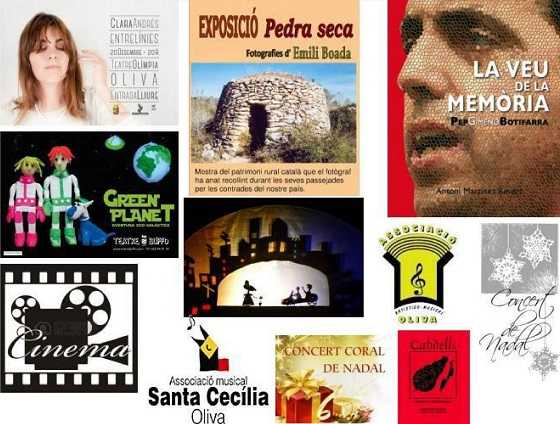 El cicle d’exposicions del mes de desembre començarà amb la del Col·lectiu Pinzellades, de l’1 al 7 de desembre, a la Sala d’Exposicions de la Casa-Museu de Maians; Exposició itinerant “La Pedra Seca” del Museu Etnològic de Barcelona, del 6 de desembre a l’11 de gener de 2015, al Museu Etnològic; Exposició fotogràfica “Racons d’Oliva” de Joan Costa, del 6 de desembre a l’11 de gener, al Mercat Municipal; Exposició de Nadal d’ACCO, del 9 de desembre al 7 de gener, a la Sala d’Exposicions de la Casa-Museu de Maians. La programació de desembre finalitzarà amb la presentació del núm. 12 de la Revista Cabdells de l’Associació Centelles i Riusech, el 29 de desembre a les 19.30 hores a l’Aula Maiansiana, a càrrec de Manel Arcos i Antoni Esteve.