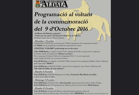 Programació festiva i cultural del 9 d’octubre a Aldaia Ací tens la programació festiva i cultural amb la qual commemorarem el 9 d’octubre. Per a començar, demà no et perdes el “I Festival Colors”, art i teatre a l’aire lliure!