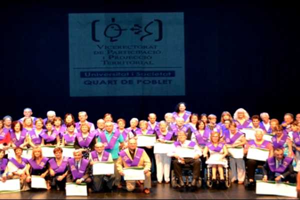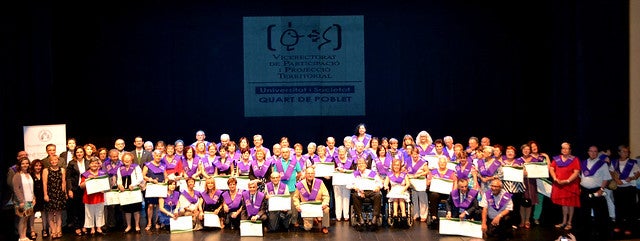 L’Auditori Molí de Vila de Quart de Poblet va acollir ahir la graduació de la primera promoció de Unisocietat, el programa que desenvolupa la Universitat de València amb la col·laboració de l’Ajuntament i el patrocini de Caixa Popular. L’alcaldessa, Carmen Martínez, va imposar la corresponent beca a cadascun dels graduats i graduades, que van rebre un diploma de mans del vicerector de Participació i Projecció Territorial, Jorge Hermosilla. Han sigut 80 les persones majors de 30 anys que han culminat els seus tres anys de formació, 360 hores d’aprenentatge en matèries com a Història, Ecologia, Literatura, Física, Psicologia, Economia, Salut, Música o Patrimoni valencià, entre altres matèries.