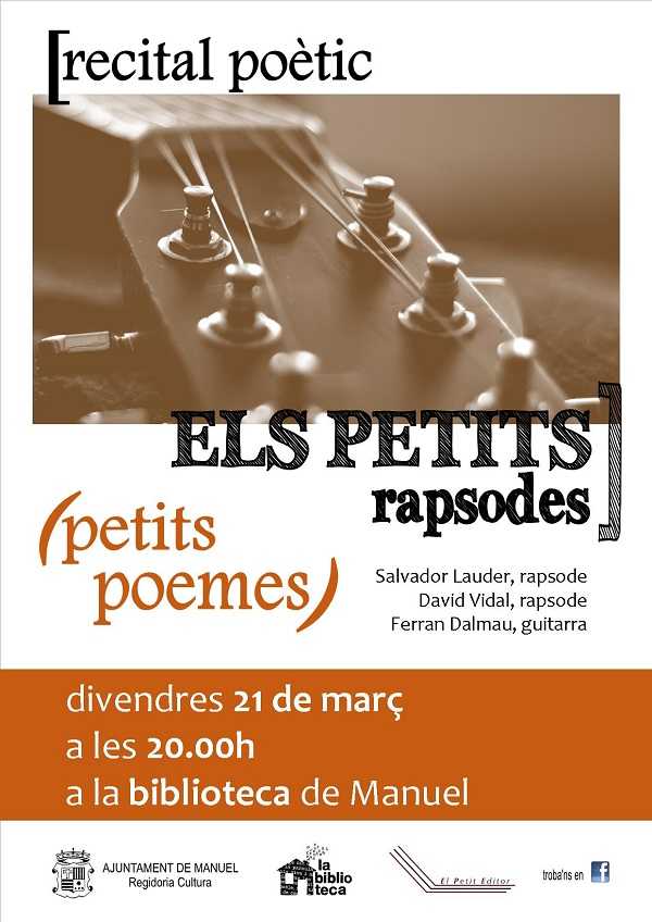 Els petits rapsodes naixen de la unió de Salvador i David, amb acompanyament musical d’autor a la guitarra, amb el company Ferran Dalmau. De l’estima per la poesia uneixen veus i esforços per crear un espectacle recitat.