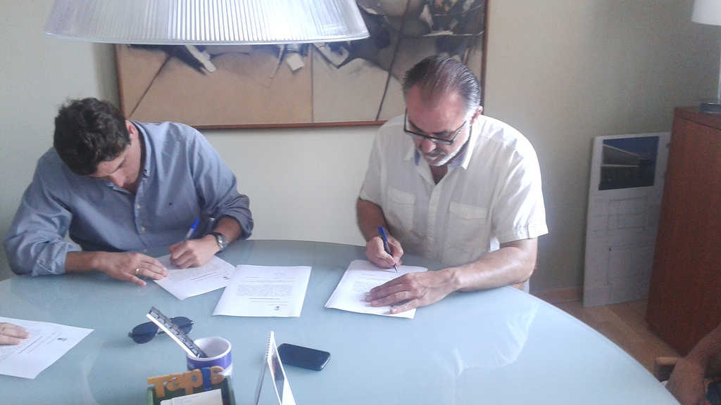 El passat dijous tingué lloc la signatura de l’acta de comprovació de replanteig de les obres del pavelló esportiu municipal de Pedreguer. Sergi Ferrús, alcalde de Pedreguer; Francisco Rodríguez Trives i Joan Felipe Ribes Aranda, arquitectes tècnics de la Direcció Facultativa, Carlos Pérez Campaña, en representació de l’empresa que el durà a terme, i Fernando Valderrama Garre, un dels arquitectes autors del projecte, han signat el document que dóna inici a l’execució de les obres.