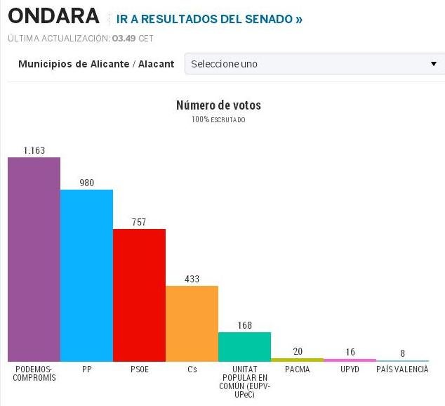 Respecte als resultats de les eleccions generals, la coalició Compromís-Podemos s’ha situat com a primera força política en estes Eleccions Generals de 2015 a Ondara, aconseguint 1.163 vots, el 32’26% del total; i sumant 183 vots més que el PP, que ha quedat com a segona força més votada a Ondara, amb 980 vots, el 27’18%. El PP ha perdut 24 punts (24%) respecte a les generals de l’any 2011, amb 824 vots menys en les eleccions d’ahir respecte a les de 2011 (fa quatre anys va obtindre 1.804 vots, el que suposaven el 51,29% del total). El PSOE queda com a tercera força política a Ondara, amb 757 vots, el 21% del total, el que suposa un 8% menys que en 2011, amb 265 vots menys que fa quatre anys (va obtindre 1.022, el 29,06% en 2011).