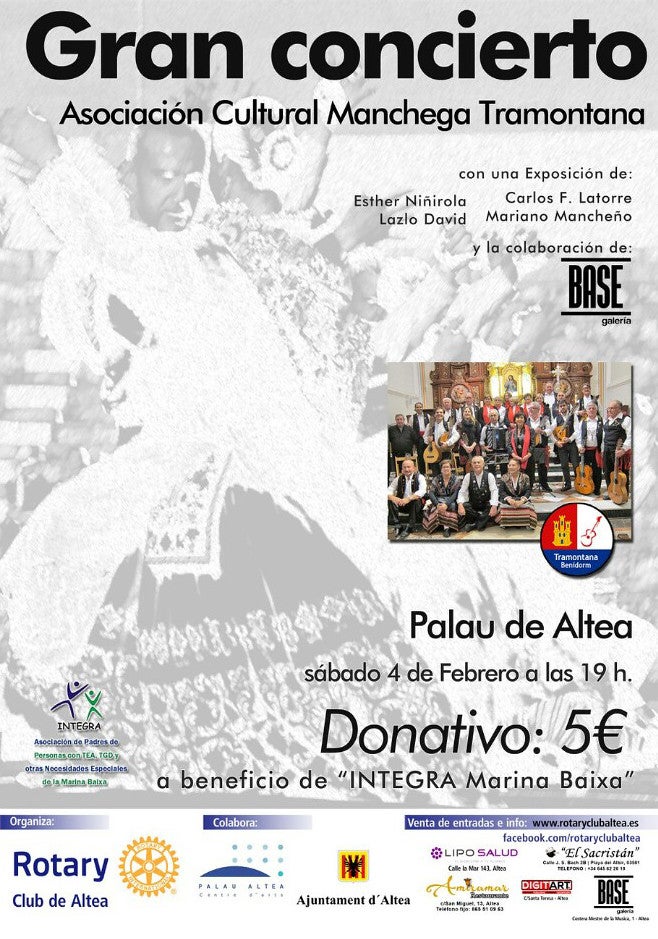 El pròxim dissabte, 4 de febrer, el Rotary Club d’Altea ha organitzat un gran concert a benefici d’Integra Marina Baixa (l’Associació de Pares de Persones amb TEA, TGD i altres necessitats especials), amb la col·laboració de la Regidoria de Benestar Social, Igualtat i Sanitat de l’Ajuntament d’Altea. Palau Altea, que també col·labora en l’activitat, acollirà a les 19 hores la gala que oferirà l’Associació Cultural Manxega Tramontana, a més també es celebrarà una exposició d’Esther Niñirola, Lazlo David, Carlos F. Latorre i Mariano Mancheño, amb la col·laboració de la galeria Base.