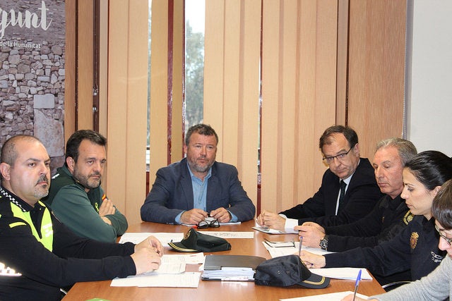 L’alcalde de Sagunt, Quico Fernández; la regidora d’Igualtat, María Giménez; la regidora de Festes i Cultura Popular, Remei Torrent, i el regidor d’Urbanisme, Pablo Abelleira, s’han reunit amb representants de Policia Local, Policia Nacional, Guàrdia Civil, Guarderia Rural i de Subdelegació del Govern.