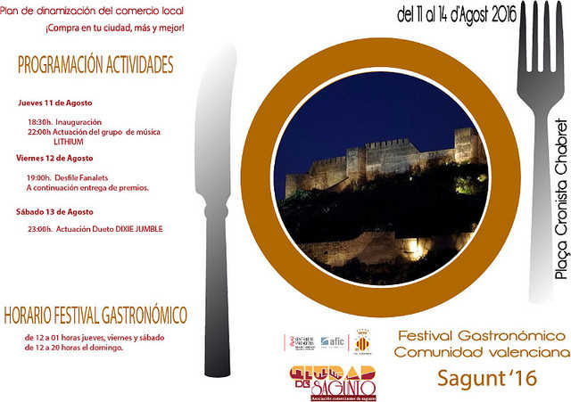 Les delegacions de Comerç i de Turisme de l’Ajuntament de Sagunt han col·laborat amb l’Associació de Comerciants Ciutat de Sagunt, que ha organitzat el primer Festival Gastronòmic Comunitat Valenciana. L’alcalde de Sagunt, Quico Fernández, inaugura aquesta vesprada a partir de les 18:00 h. aquesta primera edició que conjuga gastronomia amb concerts musicals. Se celebrarà fins al diumenge, 14 d’agost, en la plaça Cronista Chabret de Sagunt.