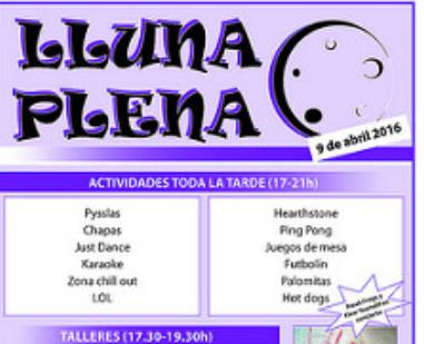 La iniciativa Lluna Plena compta amb activitats molt diverses. Entre elles, activitats d’animació: realització de xapes, ball, karaoke, jocs de taula, futbolí, ping-pong, així com una zona chill out on escoltar bona música. A més, hi haurà tornejos de videojocs, Hearthstone i LOL, que continuaran després de l’èxit del passat Lluna Game, del 12 de març. Cal destacar que hi haurà tallers de globoflèxia o expressió corporal, en horari de 17.30 a 19.30 hores.