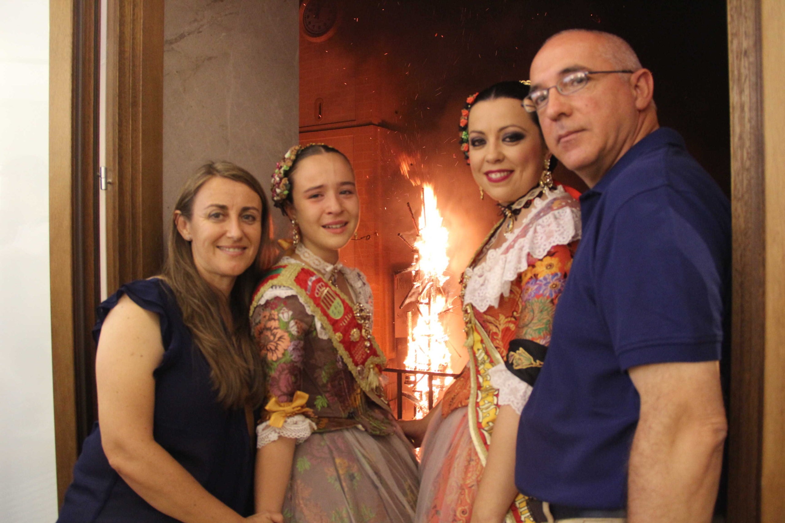 L’alcalde de Sant Vicent, Jesús Villar, i la regidora de Festes, Asunción París van seguir des de la balconada de l’antiga casa consistorial la cremà i la posterior banyà, que va remullar d’a dalt a a baix a centenars de joves que esperaven aquest moment.