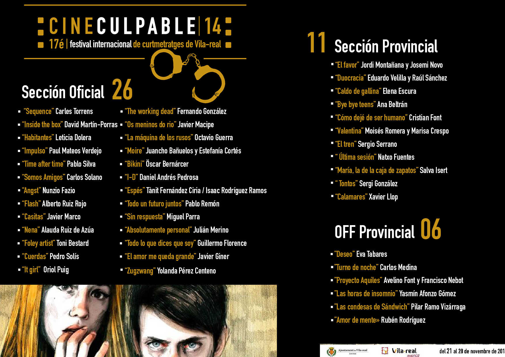 L’organització ha fet públics també els sis curtmetratges que es projectaran a l’Off Provincial el dilluns 24 de novembre per la vesprada en l’Espai Jove de Vila-real: ‘Deseo’ (Eva Tabares); ‘Turno de noche’ (Carlos Medina); ‘Proyecto Aquiles’ (Avelino Font y Francisco Nebot); ‘Las horas de insomnio’ (Yasmín Afonzo); ‘Las condesas de Sándwich’ (Pilar Ramo) y ‘Amor de mente’ (Rubén Rodríguez).
