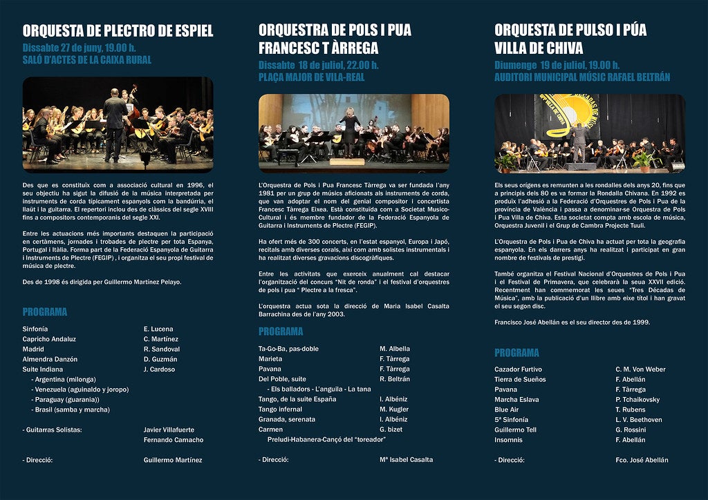 El cap de setmana del 18 i 19 de juliol, el Plectre a la fresca reprendrà els concerts, amb l’actuació de l’orquestra amfitriona i la Pols i Pua Villa de Chiva. L’orquestra Francesc Tàrrega farà valdre els seus 34 anys i més de 300 concerts de trajectòria amb un programa musical en el qual no faltaran el mestre Tàrrega, Albéniz o Bizet, sota l’adreça de María Isabel Casalta.
