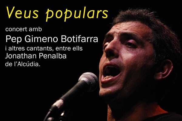 Demà, divendres 24 de març, a les 22.30 de la nit, Pep Gimeno “Botifarra” i altres cantants, entre ells el cantant alcudià de cant popular, cançó tradicional i cant d’estil, Jonathan Penalba, interpretaran el concert VEUS POPULARS a la Casa de la Cultura de l’Alcúdia.