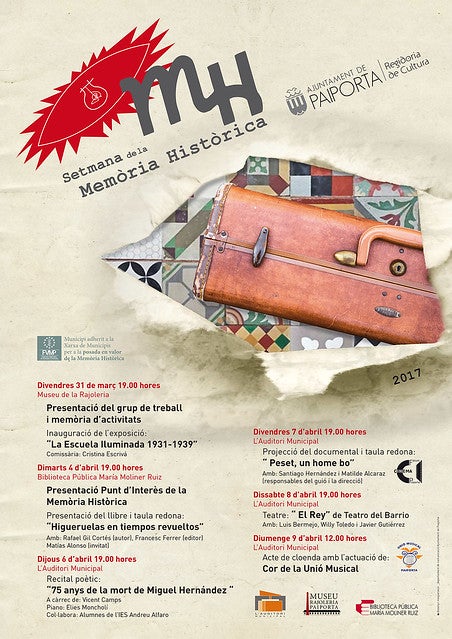 Paiporta viurà des d’aquest divendres i fins el 9 d’abril la primera edició de la Setmana de la Memòria Històrica. Al llarg dels pròxims dies, teatre, poesia, testimonis orals, cinema, literatura i música protagonitzaran la vida cultural de la localitat. Les activitats, programades per la regidoria de Cultura, han estat fruit dels primers passos del grup de treball per la memòria històrica, constituït els últims mesos amb tècnics municipals, càrrecs polítics i ciutadania de Paiporta.