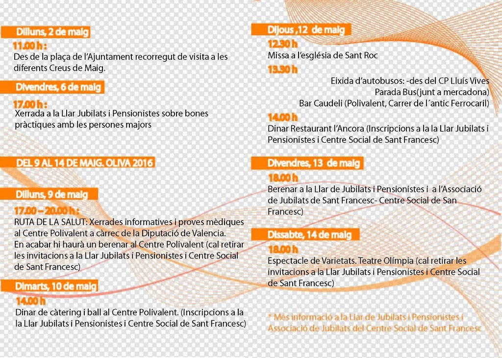 La primera de les activitats de la setmana tindrà lloc dilluns, 9 de maig, amb una sèrie de xerrades informatives denominades “Ruta de la Salut” que organitza la Diputació de València i on tots els assistents es podran efectuar proves mèdiques, de forma gratuïta, al Centre Polivalent, en horari de 17.00 a 20.00 hores. A continuació, es realitzarà un berenar popular per a tots els jubilats i pensionistes d’Oliva. La segona jornada d’aquesta Setmana del Jubilat serà dimarts, dia 10 de maig, amb un dinar de càtering i posterior ball al centre Polivalent.