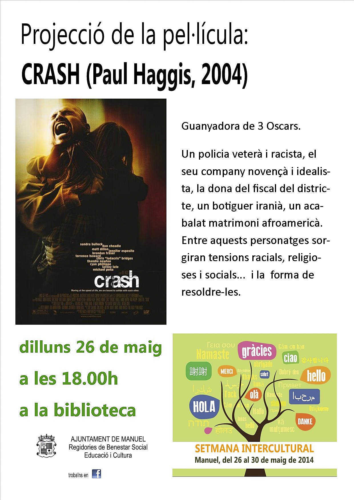 El proper dilluns 26 de maig encetem la Setmana Intercultural a Manuel amb la projecció de la pel·lícula “Crash” (Paul Haggis, 2004), guanyadora de 3 oscars, i que retrata la vida de diferents persones de diverses procedències, la vida de les quals es creua en Los Angeles.