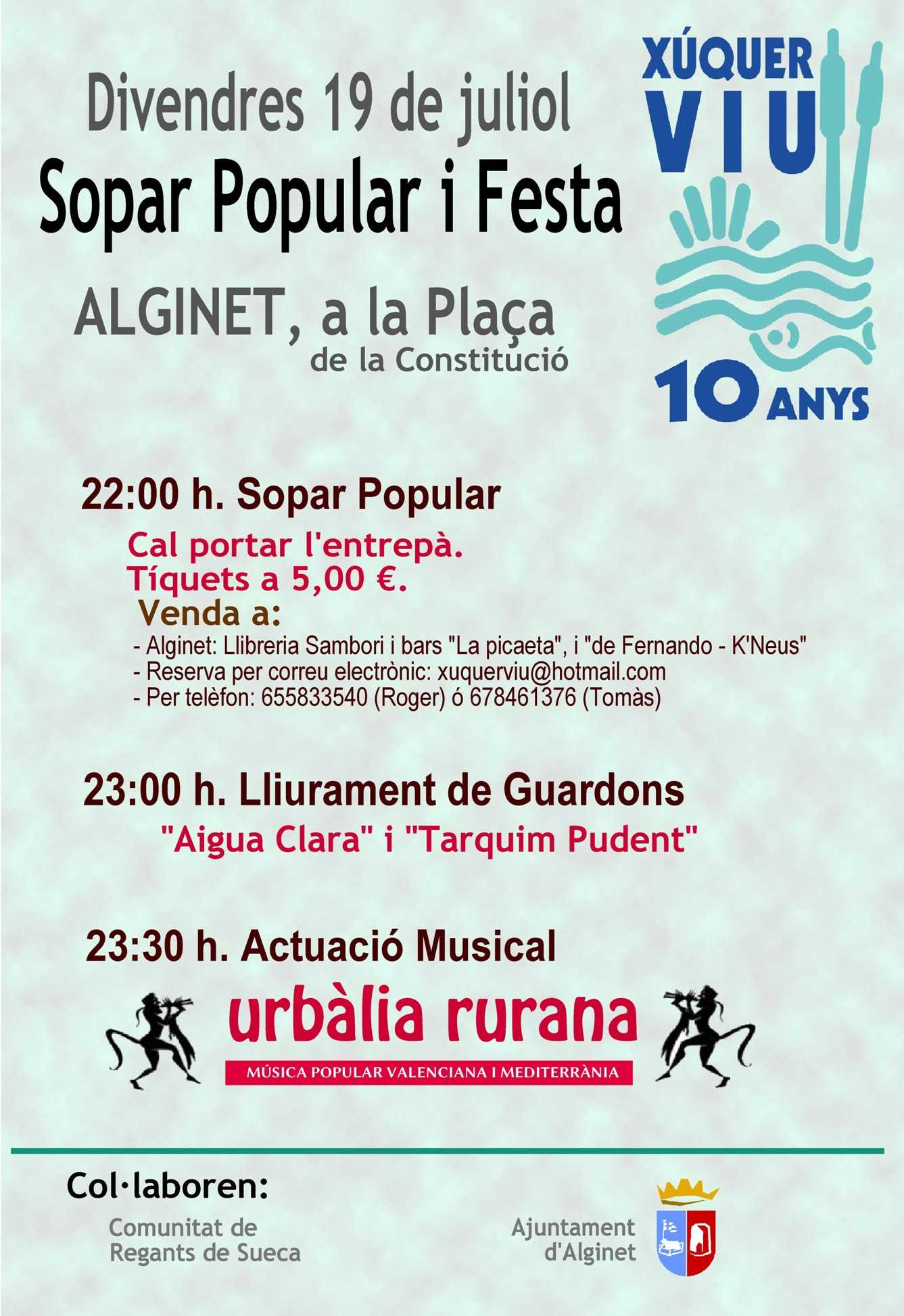 I continuant amb les activitats, el divendres es celebrarà el VIIIé Sopar popular i Festa de Xúquer Viu a la Plaça de la Constitució d’Alginet, a partir de les 10 de la nit. A continuació tindrà lloc el lliurament de la VIIIª edició dels Guardons de Xúquer Viu “Aigua Clara” i “Tarquim Pudent” i es finalitzarà la nit amb l’actuació d’Urbàlia Rurana.