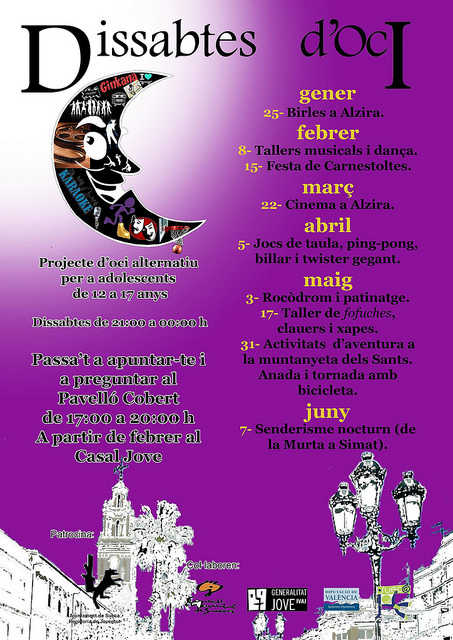 L’objectiu d’esta activitat és que els joves del municipi puguen tindre una alternativa d’oci els dissabtes, entre les 21 i les 24 hores. “Volem oferir-los activitats diferents de les habituals, com les discoteques light, etc.; activitats que puguen realitzar amb gent de la seua edat i, al mateix temps, oferint a les famílies tota la tranquil·litat perquè saben que els seus fills estan amb professionals qualificats”, ha indicat Tamarit. La inauguració en breu del Casal Jove, en el centre de la població, possibilitarà que la majoria de les activitats es realitzen en estes noves instal·lacions. A més, s’han programat, com a novetat, una eixida de cap de setmana durant les vacances de Pasqua i una eixida per a realitzar senderisme nocturn en la Murta. “La majoria de les activitats són gratuïtes, costejades per la Regidoria de Joventut. Les úniques per les quals s’abonarà una quantitat mínima seran les eixides programades a les birles, al cine, etc.”, en paraules de Tamarit.
