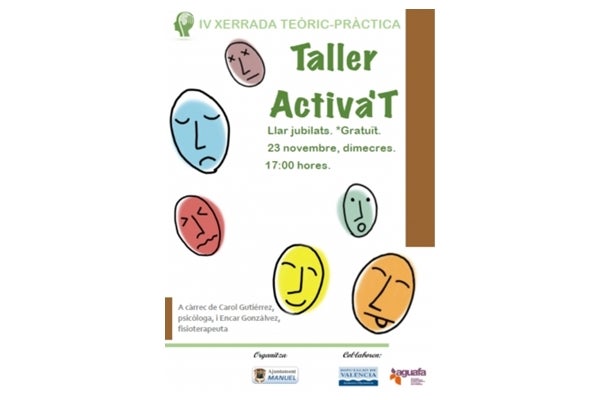 Taller desenvolupat per la psicòloga, Carol Gutiérrez, i la fisioterapeuta, Encar Gonzálvez, que dedicaran una sessió d’hora i mitja a treballar l’ànim i la cognició a través de l’ús de l’activitat física amb jocs, circuits i altres activitats que milloren els sentiments i produeixen emocions més adaptades i saludables tot amb el ingredient principal de moure’s.