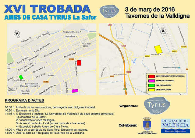 Enguany, Tavernes de la Valldigna acollirà la XVI Trobada d’Ames de Casa Tyrius de la Safor, que es celebrarà el dia 3 de març. Vora 600 dones de tots els pobles de la Safor es reuniran per a commemorar el Dia de la Dona. L’acte està organitzat per l’associació Tyrius i compta amb la col·laboració de l’Ajuntament de Tavernes i de la Diputació de València.