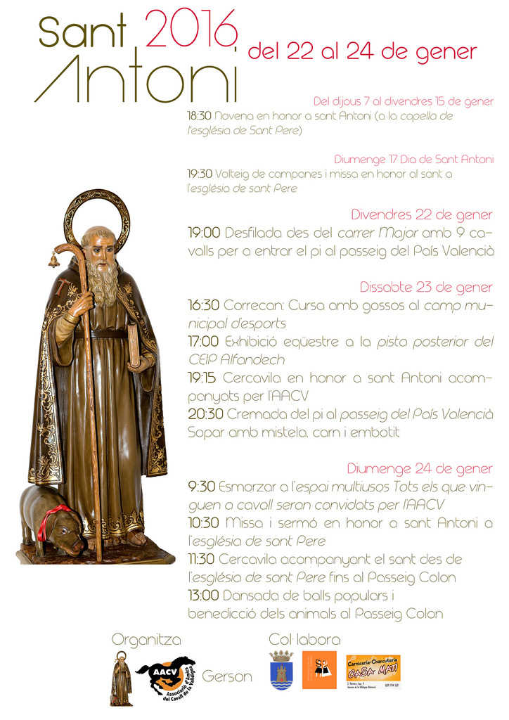 La Comissió de Festes Sant Antoni Abad, Gerson i l’Associació d’Amics del Cavall de la Valldigna, junt amb la col·laboració de l’Ajuntament de Tavernes, han organitzat diverses activitats per a celebrar la festivitat de Sant Antoni durant els dies 22, 23 i 24 de gener.