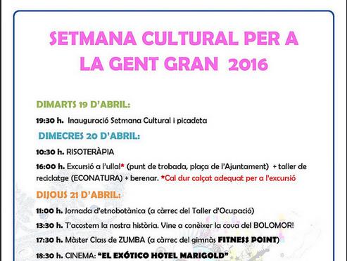 La inauguració de la Setmana Cultural serà el dimarts 19 d’abril a les 19.30 hores, i també hi haurà una picadeta. El dimecres 20 d’abril tindrà lloc un taller de risoteràpia a les 10.30 hores, i de vesprada una excursió a l’ullal (que eixirà des de la plaça de l’ajuntament a les 16 hores), un taller de reciclatge i berenar.