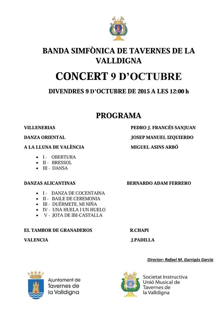 El divendres dia 9 celebrarà el tradicional concert la Banda Simfònica de Tavernes de la Valldigna en l’auditori de la Societat Instructiva Unió Musical, a les 12 hores.