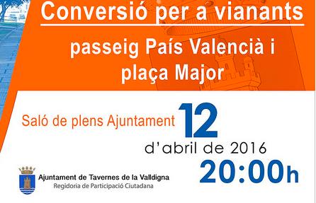 L’Ajuntament de Tavernes, a través de la Regidoria de Participació Ciutadana, ha organitzat una reunió per a tractar el tema de la possible conversió per a vianants del passeig del País Valencià i de la plaça Major, és a dir, fer estes zones per a transeünts.