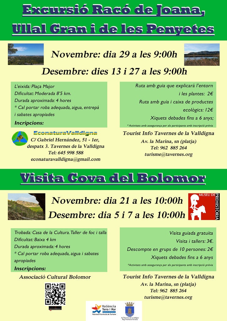 L’Ajuntament de Tavernes, a través del projecte anomenat “Dinamització del turisme de Tavernes de la Valldigna”, comença noves visites guiades a la cova del Bolomor, així com també excursions al Racó de Joana, l’Ullal Gran i de les Penyetes.
