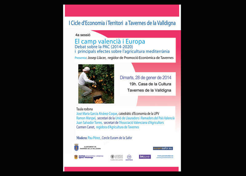 El dimarts 28 de gener, a les 19 hores i en la Casa de la Cultura de Tavernes, El camp valencià i Europa. Debat sobre la PAC (2014-2020) i principals efectes sobre l’agricultura mediterrània, presentat pel regidor de Foment Local, Josep Llàcer.