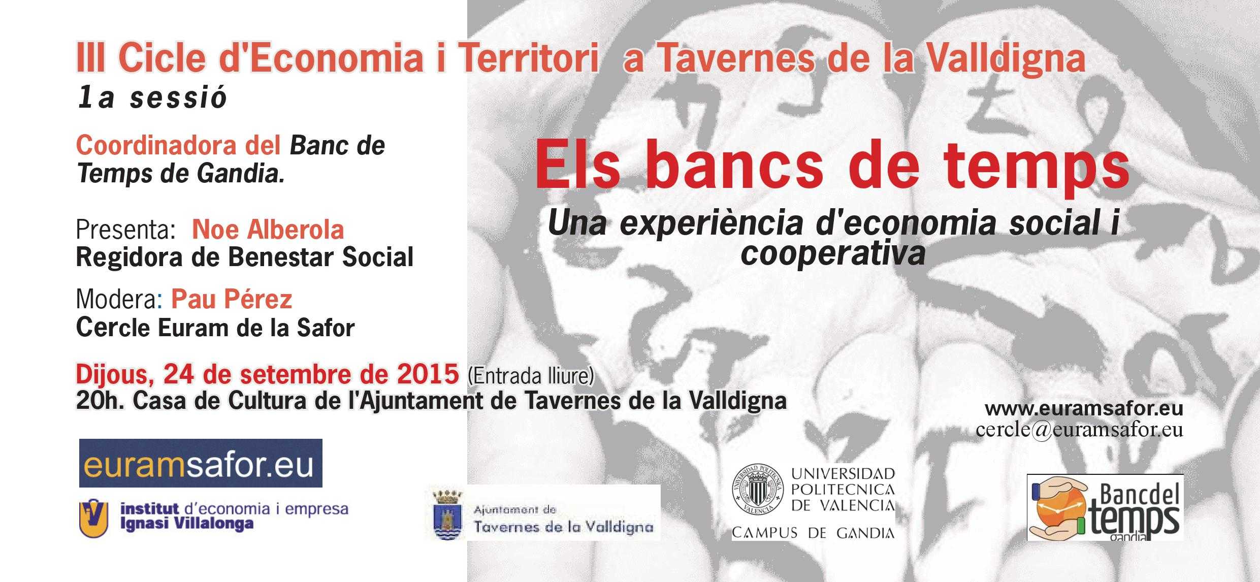 L’Ajuntament de Tavernes, a través de la regidora de Serveis Socials i Cooperació, Noelia Alberola, la Coordinadora del Banc de Temps de Gandia i el Cercle Euram de la Safor, inicien la primera sessió del III Cicle d’Economia i Territori amb “Els bancs de temps: una experiència d’economia social i cooperativa”.