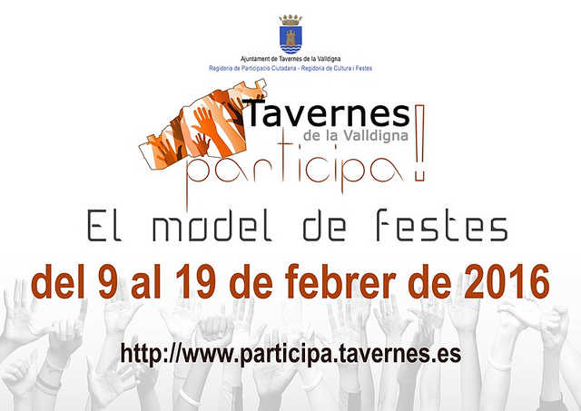 La Regidoria de Transparència i Participació i la Regidoria de Festes de l’Ajuntament de Tavernes obrin el termini per a poder opinar en l’enquesta sobre el model de les festes patronals de Tavernes, que ha començat a les 8 hores de hui (9 de febrer) i que acabarà el pròxim dia 19 de febrer a les 23:59h.