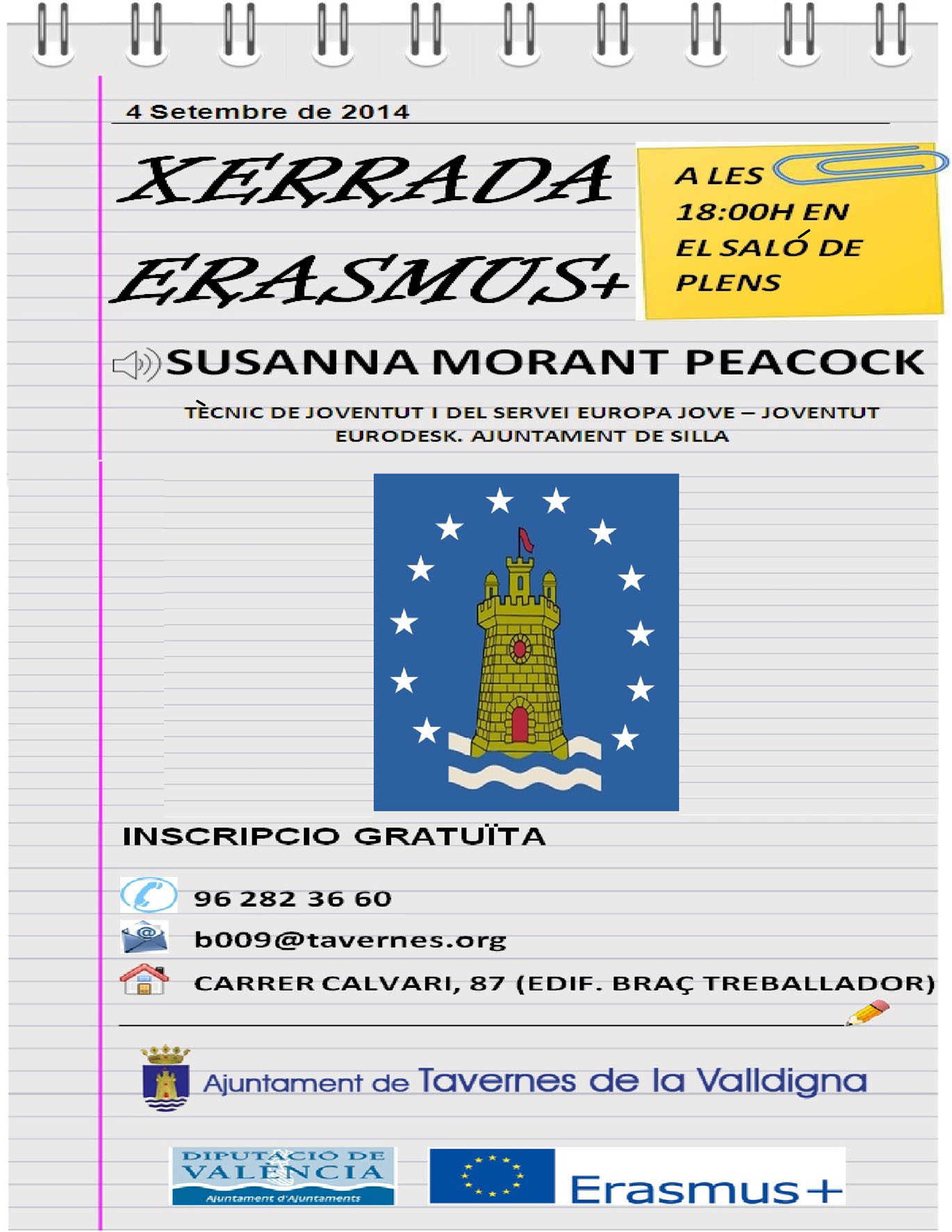 El regidor responsable de Foment i de Joventut, Josep Llàcer, ha confirmat que hi assistirà com a ponent Susanna Morant Peacok, tècnica de Joventut i del Servei Europa Jove-Joventut Eurodesk de l’Ajuntament de Silla.