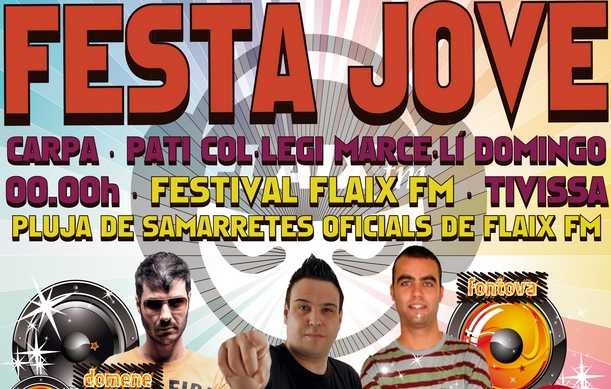 Festa Flaix Fm. Nit Jove Dia: Dissabte 16 de juliol Hora: Començarà per la nit (a les 00-00h), o siga, ja serà diumenge Lloc: Carpa del Col·legi Marcel·lí Capgirem Tivissa! Portem el ritme! Us esperem! >