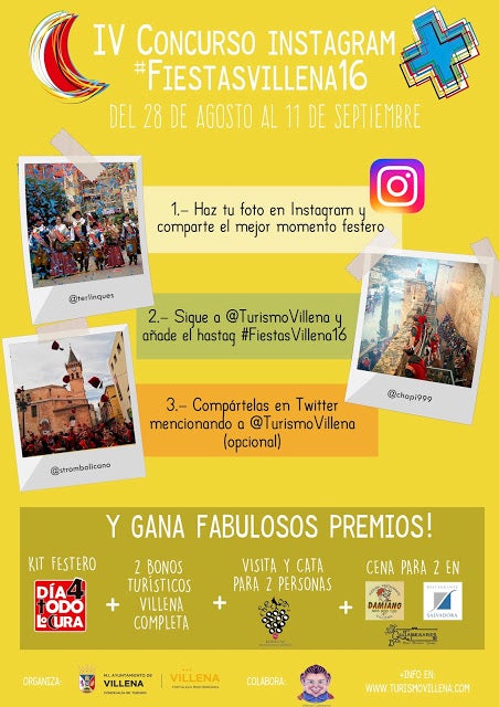 La regidoria de Festes engega per quart any consecutiu el concurs “Instagram Festes Villena”. En ell podran participar totes les persones majors de 18 anys amb compte en Instagram. Per a concursar caldrà realitzar les fotos en Instagram, ser seguidor en twitter d’@TurismoVillena, afegir les fotografies amb el hashtag #FiestasVillena16 i compartir-les en Twitter esmentant a @turismovillena.