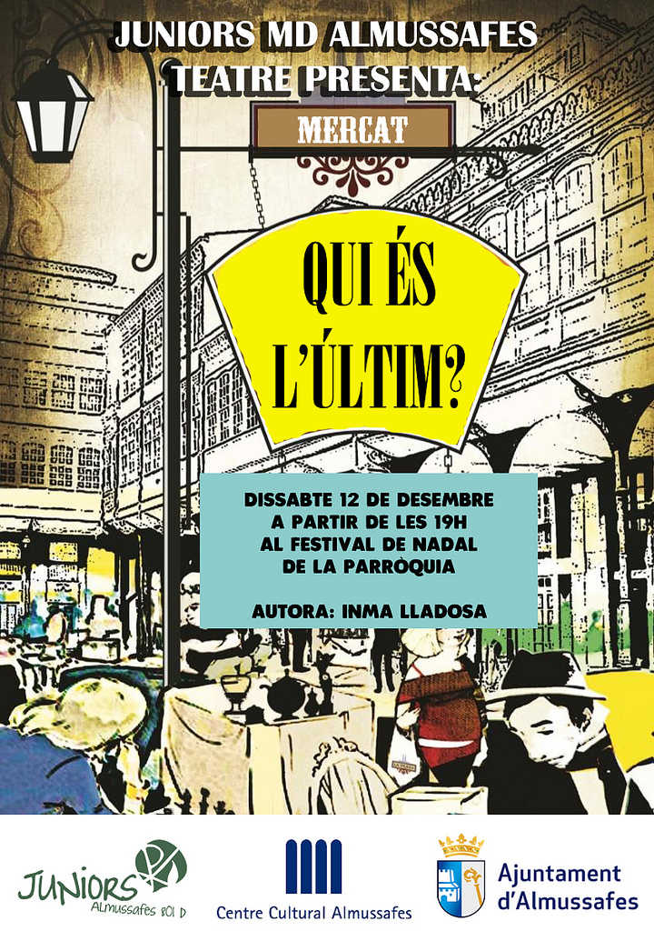 En la recta final del festival, l’Equip d’Educadors de Juniors M.D. estrenarà una nova obra teatral, escrita per Inma Lladosa i titulada “Qui és l’últim”. Ambientada en un mercat municipal, la història narra les peripècies dels comerciants en vespres de les festes de Nadal.